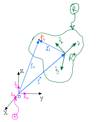 \({\bf p}^*\) is a position vector from \(O\) to the origin of the frame \(R\). We know from our discussion on direction cosine matrices that the unit vectors of \(R\) can be related to the unit vectors of \(N\) as: